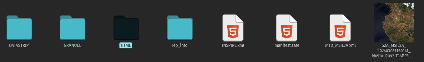 So far we have the RGB bands and the visualization for humans. But, we can do much more and take advantage of the rest of the bands we have within the data product we downloaded. Remember we had several folders with files at different resolutions? Well, there are more than RGB bands in there.