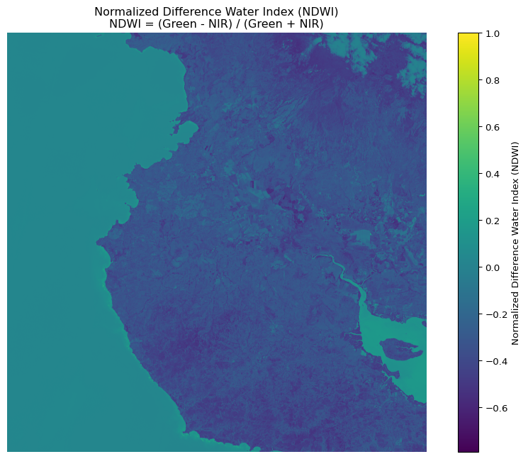 'NDWI = (Green - NIR) / (Green + NIR)')