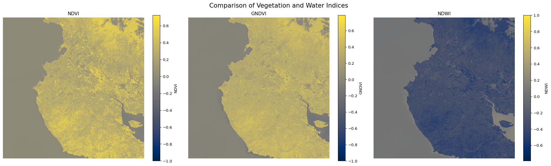 plt.suptitle('Comparison of Vegetation and Water Indices', fontsize=16)